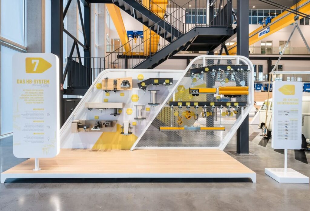 Für ABUS Kransysteme realisierte i.xpo im neuen ABUS KranHaus in Gummersbach eine Markenwelt, die Schulung, Produktpräsentation und Anwendungserlebnis auf eindrucksvolle Weise verbindet. Auf rund 1.600 m² Hallenfläche entstand ein Umfeld, das moderne Krantechnik nicht nur erklärt, sondern räumlich und funktional erlebbar macht. Klare Geometrien, offene Präsentationsflächen und die markante Farbwelt aus Weiß und Gelb schaffen eine präzise, technikorientierte Gestaltung mit hoher Wiedererkennbarkeit.
