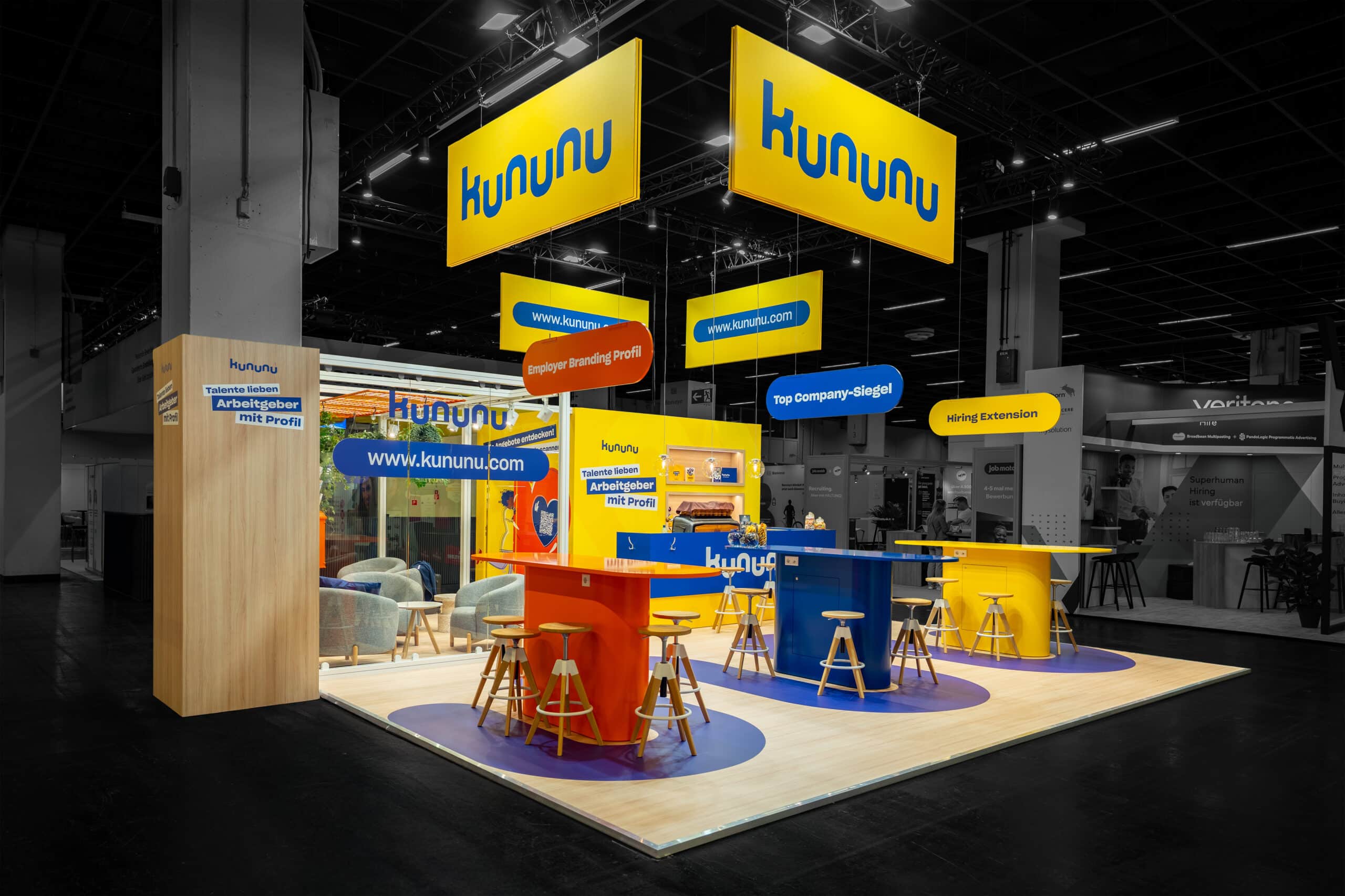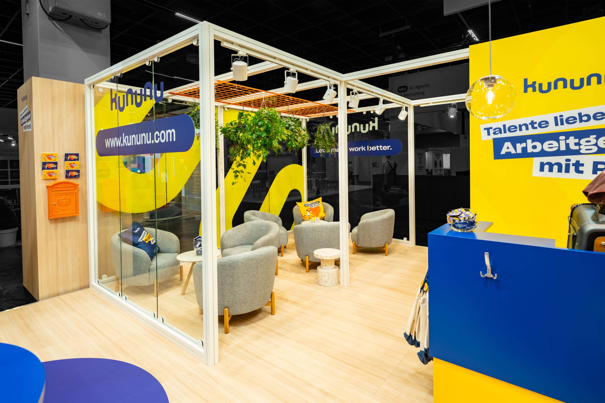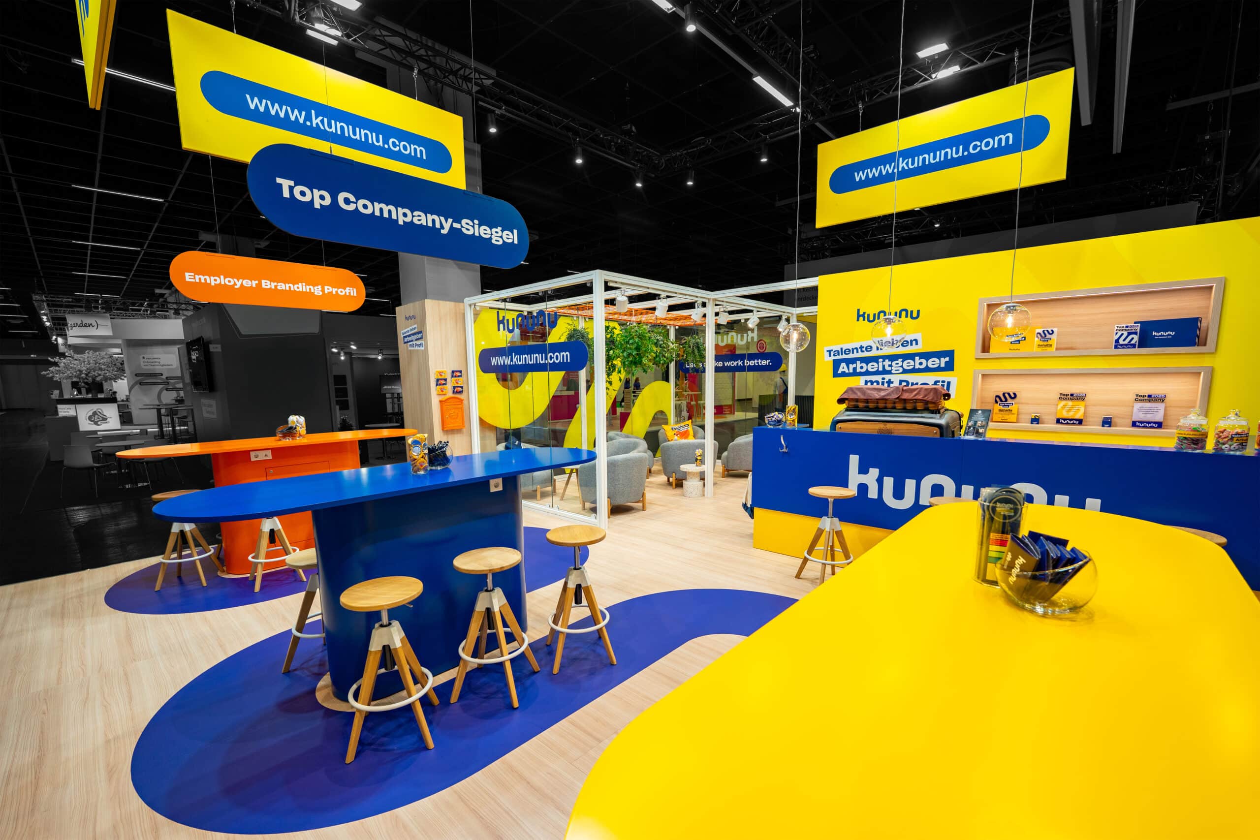 Für Kununu entwickelten wir auf der Zukunft Personal Europe einen Messeauftritt, der die Markenbotschaft rund um transparente Arbeitsplatzkultur räumlich erfahrbar macht. Im Mittelpunkt stand die Idee eines offenen Kommunikationsraums, der Besucher:innen einlädt, ins Gespräch zu kommen und die Werte von Kununu unmittelbar zu erleben.